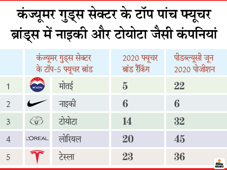 कंज्यूमर गुड्स सेक्टर के पांच फ्यूचर ब्रांड्स में चीन की लिकर कंपनी मोतई टॉप पर है। इसका मार्केट कैप 19 लाख 48 हजार करोड़ है। दूसरे नंबर पर स्पोर्ट्स गुड्स कंपनी नाइकी है। टोयोटा, लोरियल और टेस्ला भी टॉप पांच फ्यूचर ब्रांड्स की लिस्ट में शामिल हैं।