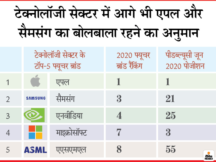 टेक्नोलॉजी सेक्टर के लिहाज से देखा जाए तो एपल टॉप पर है। नंबर तीन पर कंप्यूटर चिप बनाने वाली अमेरिकी कंपनी एनवीडिया है। एनवीडिया की फ्यूचर ब्रांड रैंकिंग माइक्रोसॉफ्ट से भी ज्यादा है। पीडब्ल्यूसी की लिस्ट में माइक्रोसॉफ्ट दुनिया की तीसरी सबसे बड़ी कंपनी है जबकि एनवीडिया 25वें नंबर पर है। माइक्रोसॉफ्ट की मार्केट कैप 112 लाख करोड़ है। वहीं, एनवीडिया का मार्केट कैप करीब 17 लाख करोड़ है।