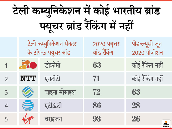 टेलीकॉम सेक्टर से फ्यूचर ब्रांड इंडेक्स की टॉप-5 कंपनियों में कोई भी भारतीय कंपनी नहीं है। कभी भारत में सबसे सस्ता प्लान लॉन्च करने वाली कंपनी डोकोमो इस लिस्ट में नंबर एक पर है। एनटीटी नंबर दो पर है। इन दोनों कंपनियों की फ्यूचर ब्रांड रैंकिंग 63 और 71 है। जबकि ये दोनों कंपनियां पीडब्ल्यूसी के टॉप-100 लिस्ट से ही बाहर हैं। चाइना मोबाइल, एटी&टी और वराइजन नंबर तीन, चार और पांच पर हैं। इनकी पीडब्ल्यूसी रैंकिंग 63, 28 और 26 है। डोकोमो जापान की मोबाइल ऑपरेटर है।