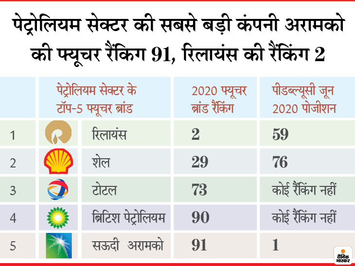 पेट्रोलियम सेक्टर की रिलायंस सबसे बड़ी फ्यूचर ब्रांड है। इंडेक्स में रिलायंस नंबर 2 पर है जबकि पीडब्ल्यूसी रैंकिंग में 59वें नंबर पर। रिलायंस की फ्यूचर ब्रांड वैल्यू अरामको से ज्यादा आंकी गई है। अरामको मार्केट कैप के लिहाज से दुनिया की सबसे बड़ी कंपनी है।